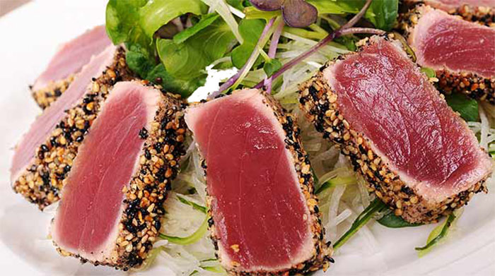 - Salpimentar y empanizar de ajonjolí el atún y cocinar al gusto (sellado, 3/4 o bien cocido).